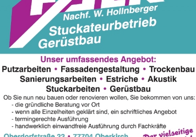 Unsere Firma ist ein mittelständisches Handwerksunternehmen. Es wurde 1949 von Stuckateurmeister Erich Falk gegründet und 1983 von Stuckateurmeister Wolfgang und Brunhilde Hollnberger übernommen. Zum 1.1.2023 ging die Firma an die Tochter Sabine Hollnberger, ebenfalls Stuckateurmeisterin, über.